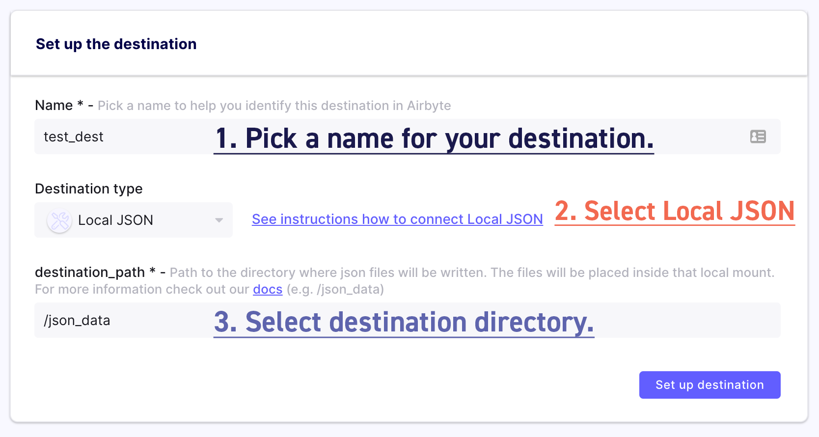 The destination we are creating is a simple JSON line file, meaning that it will contain one JSON object per line. Each objects will represent data extracted from the source.